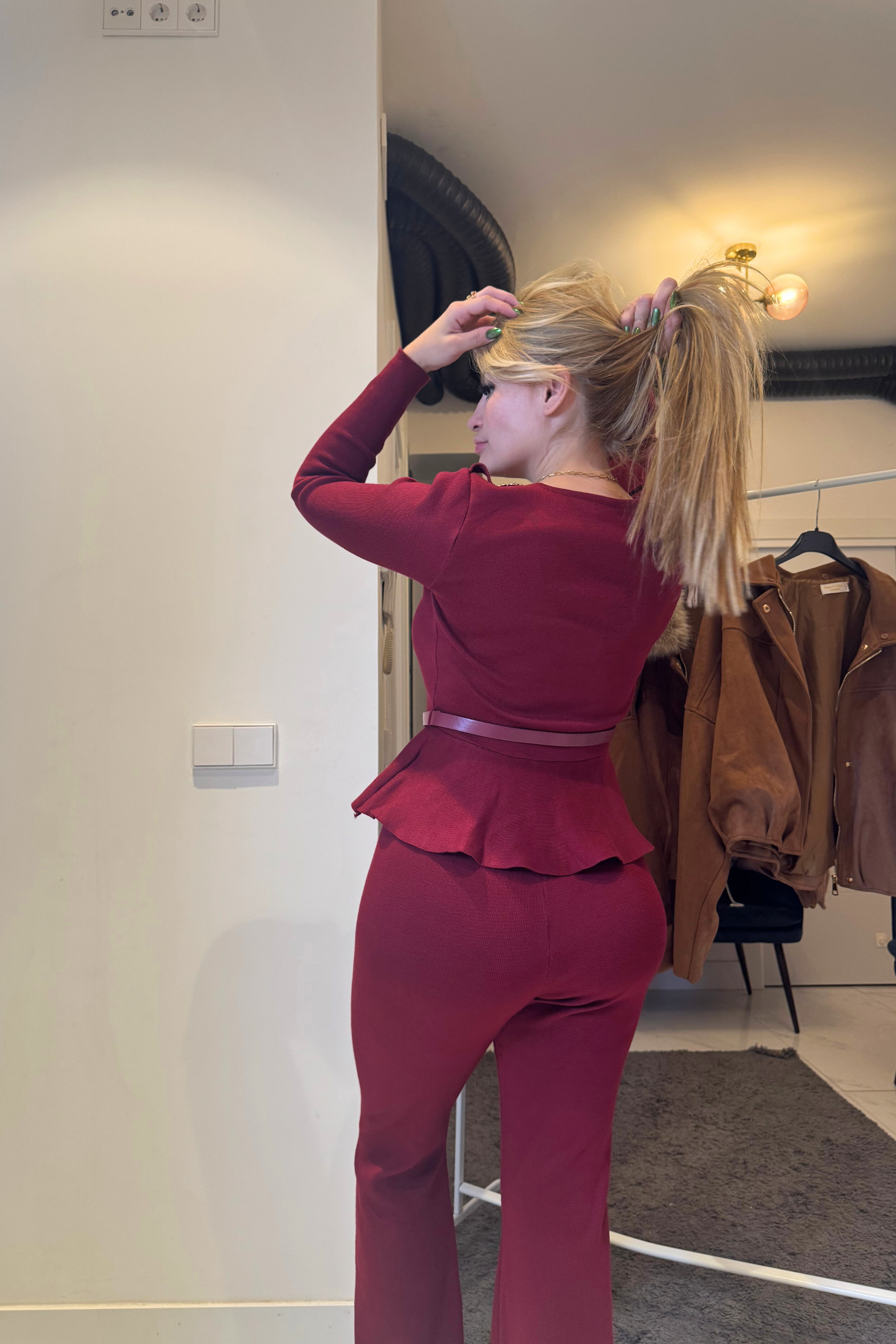 Conjunto burdeos diseñado para quienes buscan elegancia sin complicarse: su cinturón brillante aporta el toque llamativo que resuelve la falta de estilo en eventos, realza la figura sin sacrificar comodidad y ofrece un look sofisticado sin necesidad de accesorios adicionales. Perfecto para lucir sofisticada con un toque de glamour.